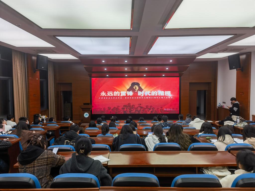 师生代表在学院二楼报告厅集中收看“永远的雷锋 时代的楷模”——江苏省纪念毛泽东等老一辈革命家为雷锋同志题词60周年主题文艺晚会。