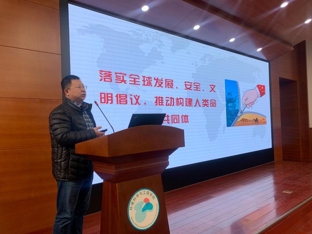 学院院长李大鹏在学院楼二楼报告厅为学院给排专业大一学生讲授题为《落实全球发展、安全、文明倡议,推动构建人类命运共同体》的形势政策课。
