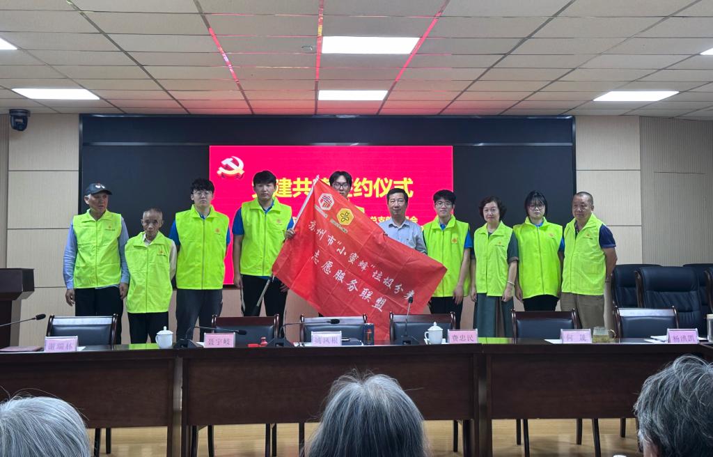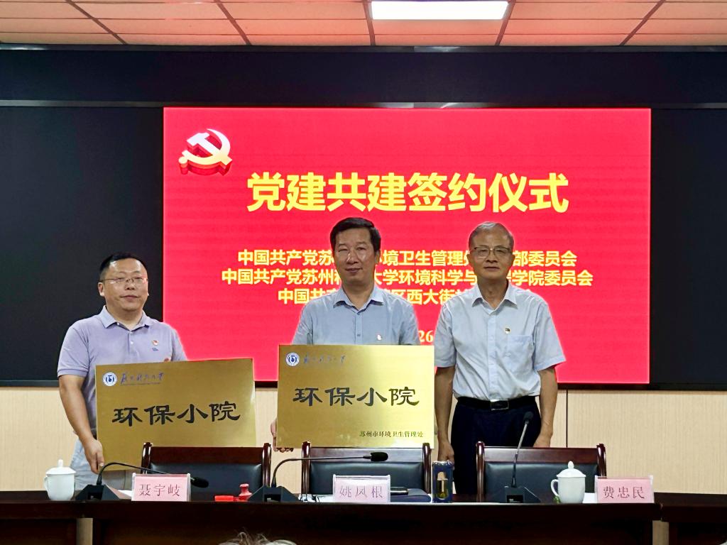 学院党委与苏州市环境卫生管理处党总支、苏州市姑苏区西大街社区党委三方共同签署了党建共建协议。费忠民为两家单位授牌“环保小院”,姚凤根为社区群众和环境学院学生志愿者授旗苏州市“小蜜蜂”垃圾分类支援服务联盟,搭建协同育人平台,强化学生实践创新能力。随后,三方人员前往光大环保、苏州市垃圾分类宣教体验中心参观学习,巩固垃圾分类相关知识,增强绿色环保意识。