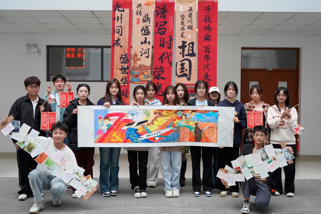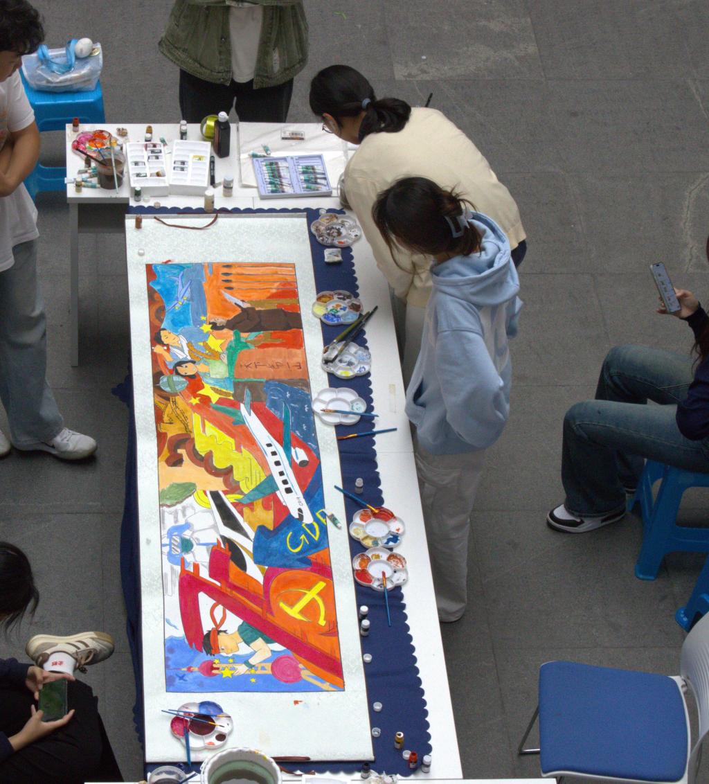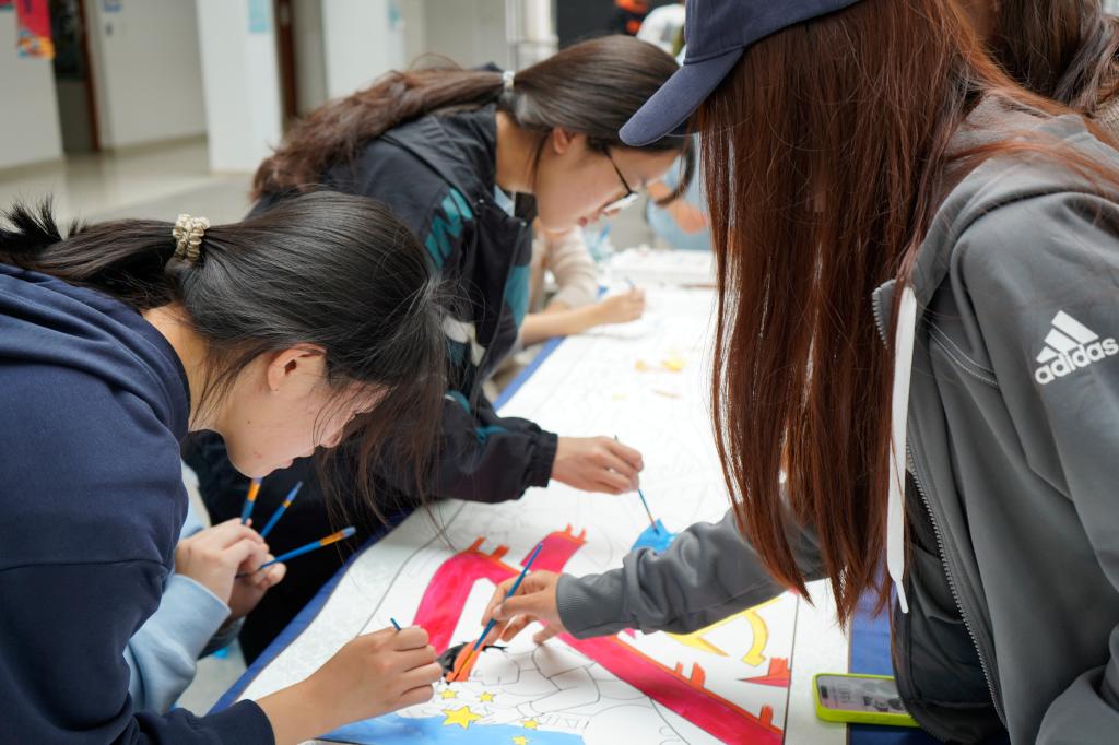现场,一幅白色的画卷等待着学生们用画笔去赋予它生命和色彩。随着活动的深入,画卷逐渐变得丰富多彩。每一笔、每一划都凝聚着学生们对祖国的深情厚谊和对未来的美好期许。他们相互讨论、交流心得,共同创作出一幅令人赞叹的画面。活动现场气氛融洽,学生们在创作中感受到了团队的力量和艺术的魅力。