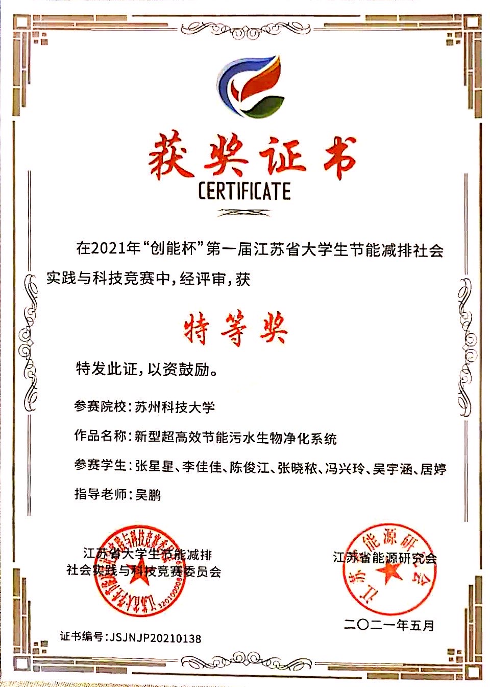 获评“创能杯”首届江苏省大学生节能减排社会实践与科技竞赛“优秀组织奖”。