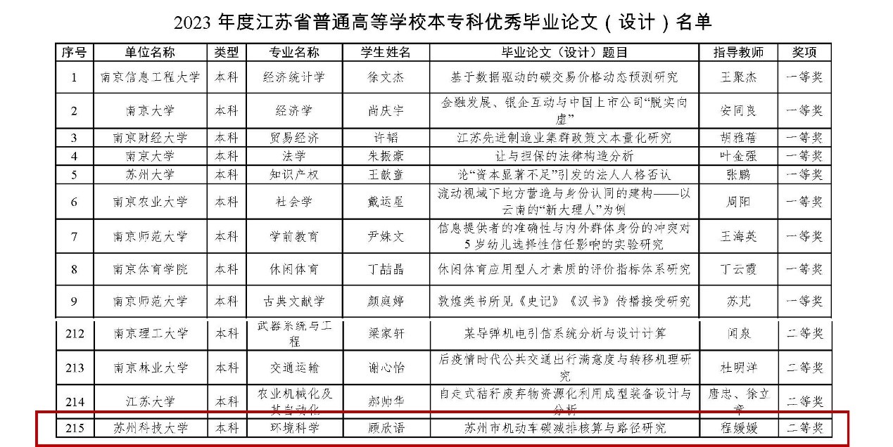 程媛媛教师指导、钱飞跃老师共同辅导的环境科学专业1912班顾欣语同学毕业论文《苏州市机动车碳减排核算与路径研究》获省优秀本科毕业设计(论文)二等奖。