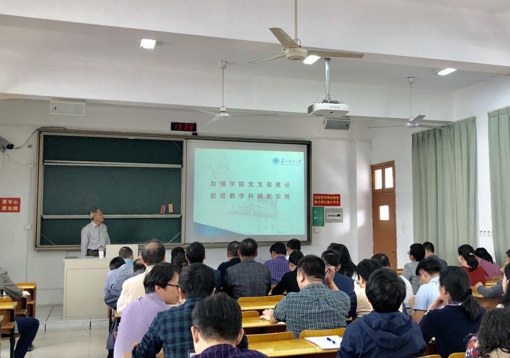 根据学校关于“不忘初心、牢记使命”主题教育工作的安排,环境学院党委书记费忠民结合主题教育调研成果,于11月1日下午在C6-312为学院全体教职工党员上了一堂题为《加强学院党支部建设,促进教学科研新发展》的党课。