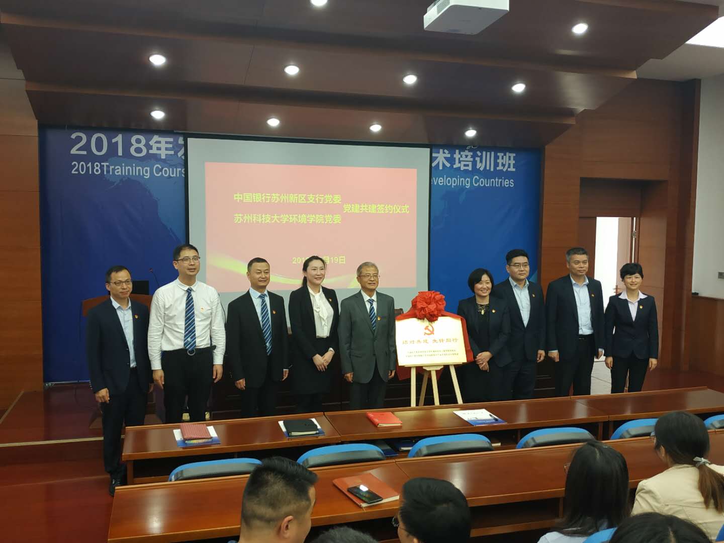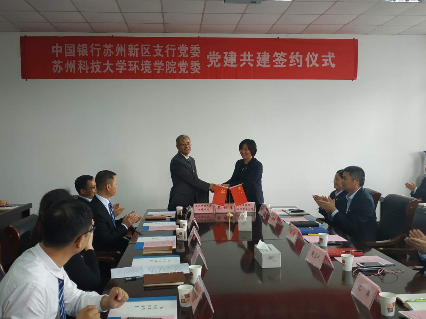 学院党委和中国银行苏州新区支行党委党建共建签约仪式在环境学院举行。环境学院党委委员、中行新区支行党委委员以及双方党支部书记参加了签约仪式。仪式由环境学院党委副书记兼副院长张菡主持。