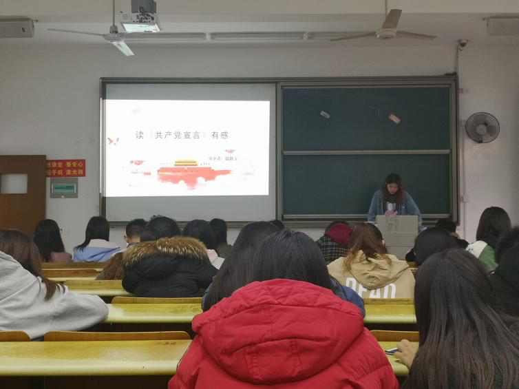 该期活动共有三个部分。在第一部分中,首先,两名主持人宣布求索学“习”大课堂第二期正式开始,然后推荐了两名该期大课堂的读书分享人,分别是环工支部的陈兆洁和温婧玉。在第二部分中,由分享人讲述自己的读书体验和心得。第一名主讲人陈兆洁分享的书目是《资产者和无产者》。她通过截取该书的具体段落为干事们介绍了资产阶级和无产阶级各自的基本内涵、兴起和发展,并明确指出无产阶级对中国国情的适用性以及对中国发展的推动作用。而第二位主讲人温婧玉与干事们交流的是《共产党宣言》。该主讲人是通过引用作者马克思与恩格斯的语录具体阐述共产主义存在和发展的必要性及对近代中国发展的重要影响,并在最后发表个人感想。在最后一个部分中,主持人对两位读书分享人的演讲进行点评与总结,并宣布求索学“习”大课堂第二期到此结束。整个大课堂期间,同学们认真聆听,积极投入,并及时拍照、记录,使读书会取得圆满成功。