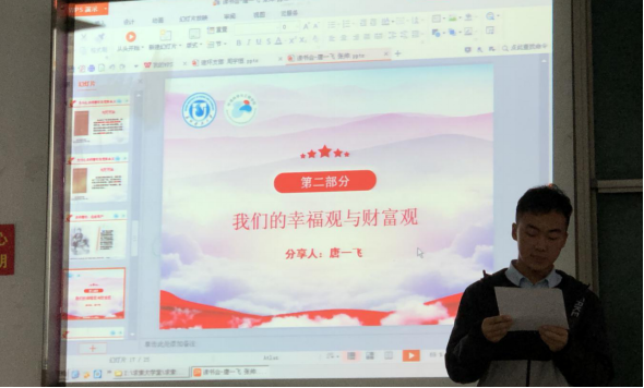 本期大课堂于15:30在C4-203正式开始。课堂伊始,17研究生党支部的赵宇豪和陈宇同学和大家分享了自己读《共产党人的15堂幸福课》的感悟。赵宇豪同学表示,有信仰的人才是最幸福的;他说道,信仰是人们奋斗的目标,是人们幸福的源泉,明确了我们共产党人心中有信仰,人民幸福才会有源泉的真理。鼓舞与课的每一位同志坚持信仰,为人民服务,不断创造幸福的源泉。