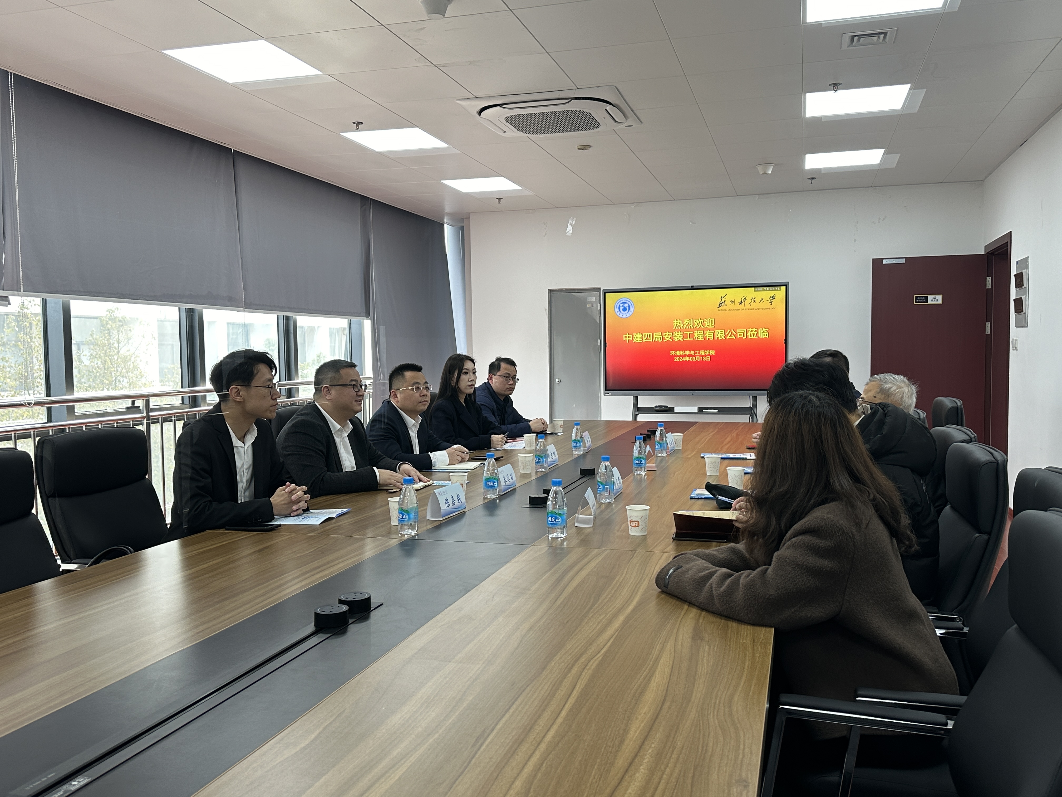 学院党委书记费忠民,党委副书记兼副院长任云高,副院长刘文如与到访的中建四局安装工程有限公司领导一行共同探讨校企合作及产教融合新模式。费忠民首先向到访的中建四局安装工程有限公司表示欢迎,感谢公司对学院毕业生的肯定,同时详细介绍了学院近年来在教学、科研以及社会服务上所取得的成绩。中建四局安装公司华东片区党委副书记秦远韬为学院近年来给企业输送的优质人才表示感谢,同时介绍了公司近年来在业务发展与员工培养方面的举措,希望继续深化校企合作与产教融合。与会双方进行了深入的交流对接。