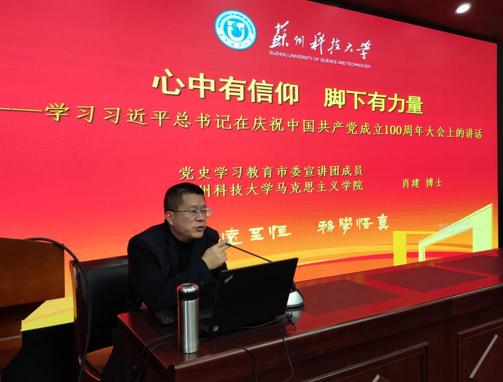 为深入推进党史学习教育走深走实,11月10日,马克思主义学院党委副书记、副院长肖建博士在环境学院二楼报告厅开展了主题为“心中有信仰,脚下有力量”的党史学习教育专题课,环境学院全体教师党员与学生党员代表参加。